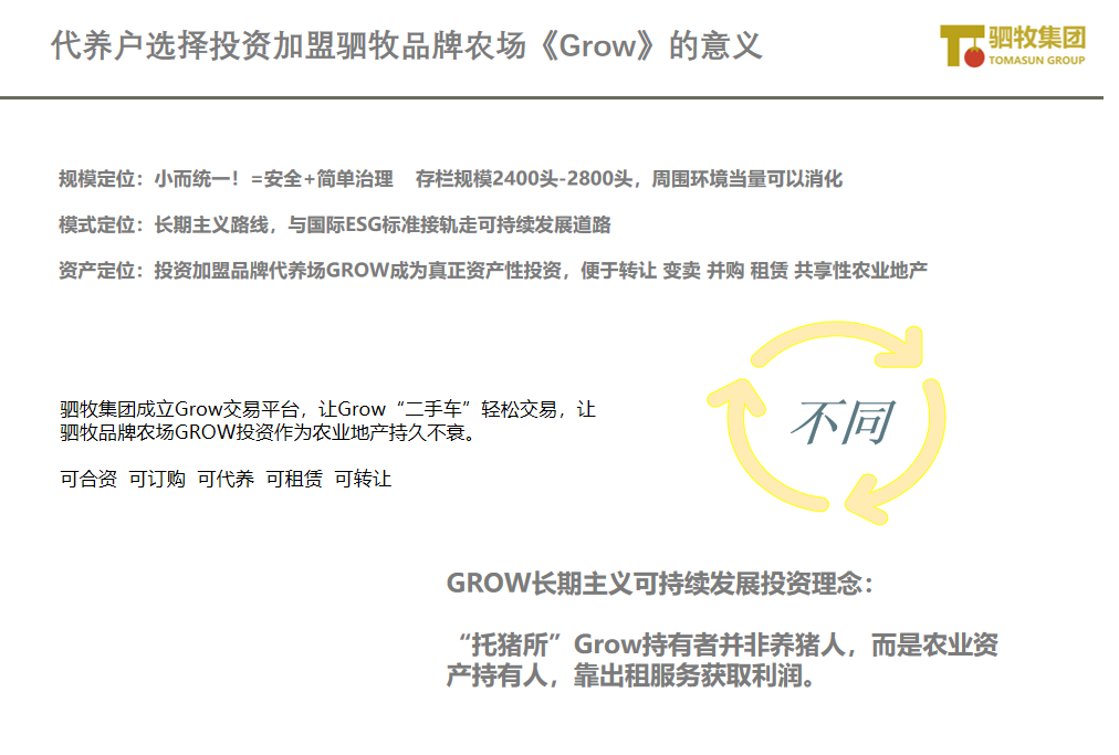 GROW-VB品牌家庭农场具有灵活的市场运营能力,具有可合资、可订购、可代养、可租赁、可转让等多种方式,使农场做真正资产化,将养猪投资的风险降到最低。